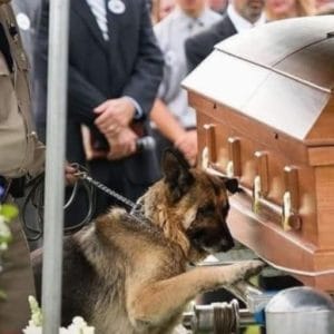 Nobody could get Rex to move. He stood like a statue at the casket, paw resting on the edge, nose pressed to the wood like he was…