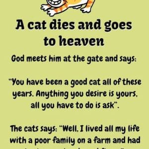 God meets him at the gate and says, “You have been a good cat all of these years.” “Anything you desire is yours, all you have to…