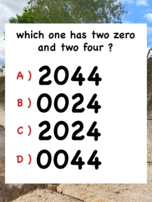 Let’s analyze each option for the question: “Which one has two zero and two four?” A) 2044 → has one zero and two fours → ❌ B)…